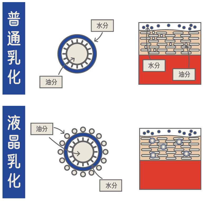 模拟正常角质层结构和组成,创造出仿肌肤脂质结构的乳液和面霜, 相比普通乳化工艺,黑科技帮产品发挥更持久的保湿效果,